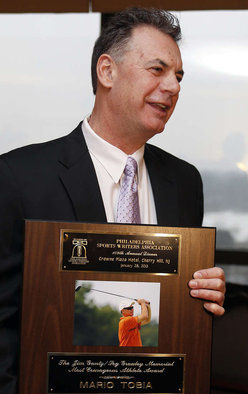 北京时间1月29日消息,已经有109年历史的费城体育记者协会周一晚宴于当地时间星期一在樱桃山的皇冠假日酒店(Crowne Plaza Hotel in Cherry Hill)举行。盲人托比亚与自己的妻子安和两个已经成年的儿子一同出席了晚宴。对于57岁双目失明的托比亚而言高尔夫球场或许并不适合。但是这的确是你可以找到托比亚的地方。事实上,他不仅打高尔夫,还打得相当好,他凭借自己的努力获得了2013年费城体育记者协会颁发的最勇敢运动员奖。